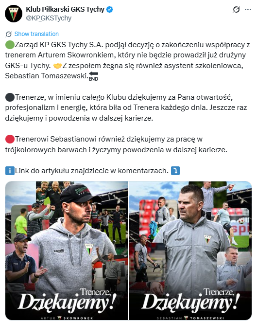 Max Kothny zapowiedział w połowie października, że nie będzie podejmował nerwowych decyzji. – Czas na wyniki i na zdobywanie punktów. Kolejna analiza czeka nas przy okazji następnej przerwy reprezentacyjnej – zapowiedział Niemiec, który jest członkiem zarządu GKS Tychy. Już w ostatnich dniach zaczęto jednak mówić, że następcą Skowronka może zostać Kamil Socha, trener Unii Skierniewice.